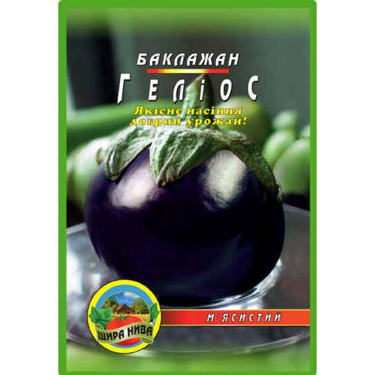 Баклажан “Геліос”. Середньо-ранній сорт. Вегетаційний період від сходів до технічної стиглості 95-120 днів. Кущ сильно рослий, висотою 70-100 см. Плоди великі, овальної форми, в біологічній стиглості червоно-фіолетового забарвлення, масою 200-300 г. М’якоть щільна, кремова, ніжна та смачна. Вирощувати баклажан рекомендується через розсаду. Плоди використовуються для консервації, переробки та в домашній кулінарії.
