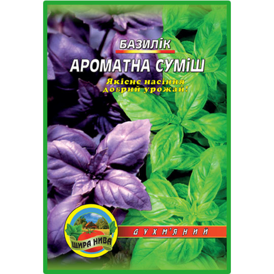 Базилік Ароматна сумиш (насіння). Барвиста суміш різних видів базиліку ароматами лимона, гвоздики, кориці, м’яти, анісу та яблука. Забезпечить різноманітність смаків та ароматів для всіх страв: універсальна за використанням у кулінарії, збуджує апетит та покращує травлення. Дозволить експериментувати із смаковими відчуттями навіть на невеликій кухні. Перші листочки готові до збирання та вживання вже через 15 днів від посіву, а максимального розміру та ароматичності досягає через 50 днів. Рослини придатні для вирощування в горщиках та балконних ящиках, що чудово відростають після зрізання. Можна підсівати та оновлювати посіви цілий рік.