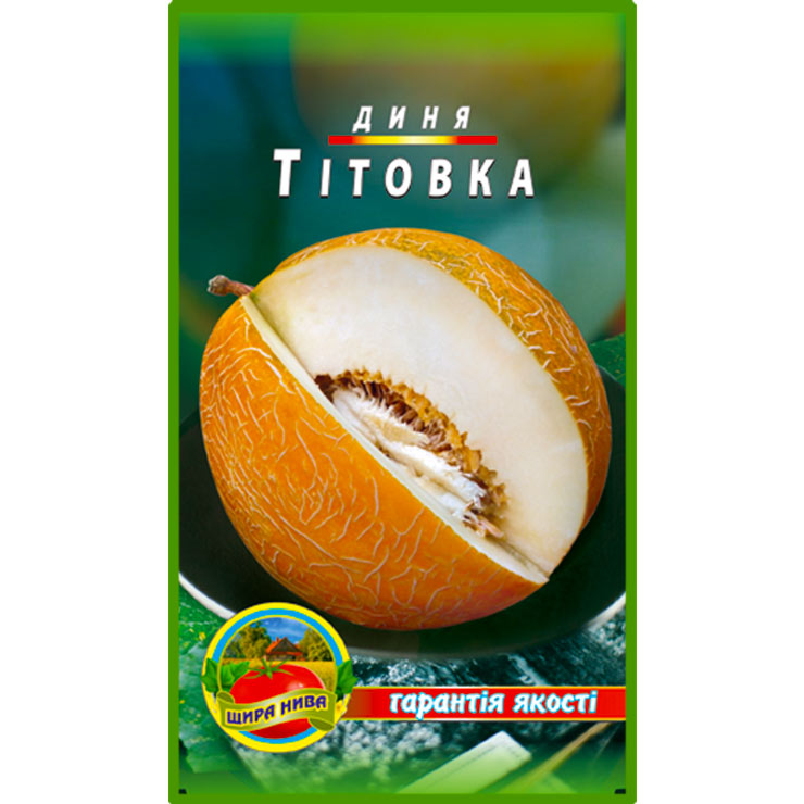 Диня “Тітовка “. Ранньостиглий, високоврожайний сорт, досягає зрілості через 55-70 днів, після сходів. Плоди овальні, жовтого забарвлення, з повною або частковою сіткою, масою 1,2-2,6 кг. М’якуш білий, іноді із зеленим відтінком біля шкірки, хрумкий, ніжний, відмінного солодкого смаку, з сильним ароматом. Сорт стійкий до хвороб, добре переносить транспортування. Споживають у свіжому вигляді. Врожайність: 2,3-3,3 кг/м2.