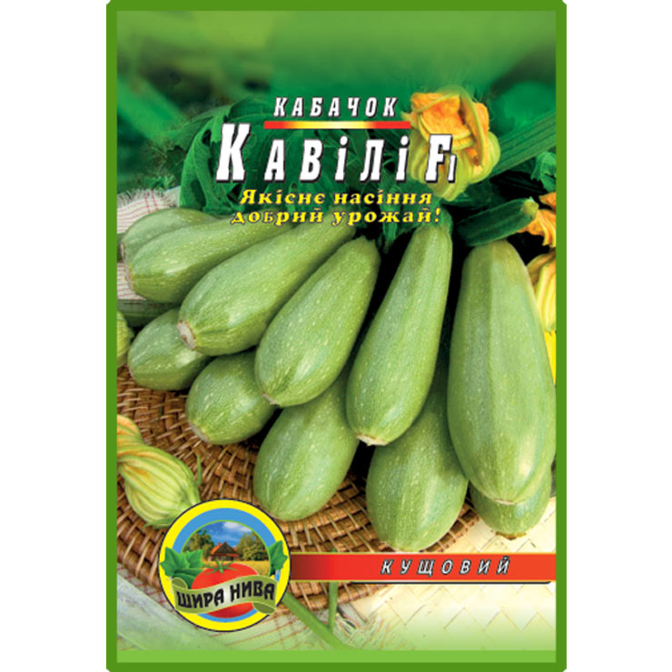 Кабачок “Кавілі F1”. Кущовий гібрид кабачка, використовують для отримання ультра ранньої та масової продукції. Відрізняється довготривалим періодом плодоношення (близько 2 місяців). Плоди циліндричні, прямі, біло-зелені з білим м’якушем, однорідні, ніжні на смак. В екстремальних умовах формує плоди без запилення, дякуючи партенокарпії. Рослини компактні, дуже продуктивні. Рекомендуються для вирощування у відкритому та захищеному грунті. Гібрид стійкий проти борошнистої роси.