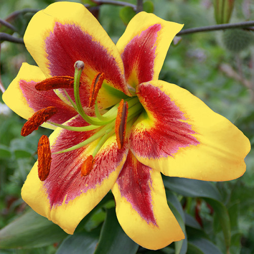 Лілія Robert Swanson – найяскравіший і життєстійкий гібрид, який підходить для одиночних/групових посадок, оформлення заміських ділянок та створення квіткових композицій. Культура випускає високе рівне стебло, по всій висоті прикрашене довгим листям смарагдово-зеленого OTтінку. У липні-серпні розпускається 10, або 20 бутонів. Пелюстки яскравого жовтого забарвлення з бордово-червоними мазками по центру помітні здалеку, а зелена горловина освіжає теплу палітру. Цвітіння лілії незабутнє завдяки приємному аромату із солодкими нотками, що посилюються вечорами. В інтернет-магазині Яскрава цибулини з Нідерландів за низькою ціною – оптом в рази дешевше.