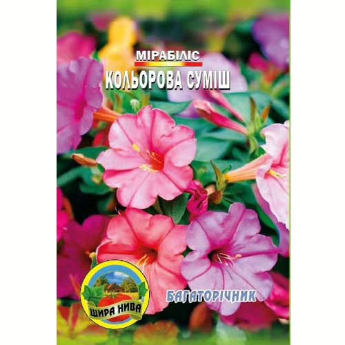 Мірабіліс Кольорова суміш. Багаторічна рослина, вирощують як однорічну, висотою 30-70см. Квітки білі, жовті, червоні, дуже запашні, відкриваються ввечері, та закриваються зранку. Квітує з кінця червня до заморозків. Висаджують у міксбортерах, групах, на газонах. Один кущ мірабілісу здатний досягати 80-100 см у висоту. Розлогі гілки прикрашає велике темно-зелене листя. Квітки мають воронкоподібну форму, трохи в’ються, в діаметрі досягають приблизно 2,5-3 см. Мірабіліс порадує яскравими фарбами кольорів – рожевий, білий, жовтий, малиновий, світло-червоний. Мірабіліс можна сіяти у відкритий ґрунт. Для цього вибирайте сонячне, захищене від протягів та вітрів місце, готуючи землю для сівби у травні. Щоб прискорити зростання мірабілісу і забезпечити раніше цвітіння однорічника, слід використовувати розсадний метод вирощування. Рекомендується садити насіння у квітні. Для цього контейнери з живильною, вологою та пухкою землею виставляють на підвіконня. Насіння поглиблюється в землю так, щоб його повністю покривав ґрунт, після чого рясно обприскують. Після проростання розсади укриття знімають. Якщо мірабіліс активно зростає, слід пікірувати розсаду в окремі ємності. Коли загроза заморозків мине, у травні можна пересадити кущики на постійне місце цвітіння. Мірабіліс радуватиме вас буянням фарб все літо.