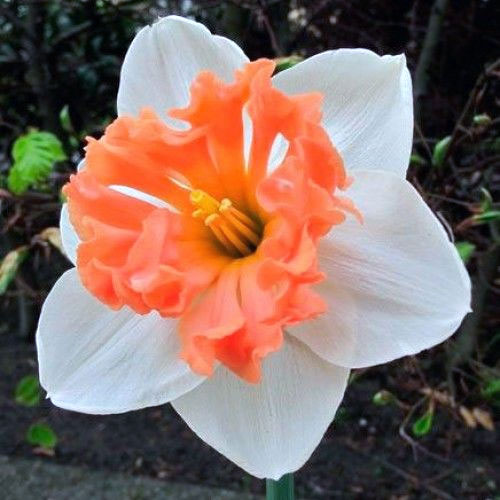 Нарцис Прекоушес (Narcissus Precocious) група крупно-корончаті. Високорослий: виростає до 45-65 см у висоту. Квітки цього нарцисса дуже ніжні, а сама рослина – утонченне. Квітки округлі, трохи повернуті вниз. Їх розмір – близько 10 см в діаметрі. Іх окраска дивовижна – молочно-білі лепестки (долі або листочки околоцветника) ефектно контрастують з абрикосовою коронкою. Коронка нарцисса кілька короче долей околоцветника (лепестков): зазвичай менше довжини долей околоцветника на третій. Но она шире, чем у других видов. Листочки околоцветника широко яйцевидні, лише слегка остроконечные, розпростерті, слегка вогнуті, перекриваються наполовину або більше. Коронка (трубка) з гофрованим краєм і глазком в центрі. Вона світло-розово-помаранчева з вкрапленнями більш темного тону і блідне до основи і на ободі. Квітки істочают ніжний аромат. Вони розцвітають першими і мають тривалий період цвітіння (3 неділі). Цветонос один. Терміни цвітіння: – квітень. Квітка класична, велика. Розмножується відмінно. Дає чудову вигонку.
