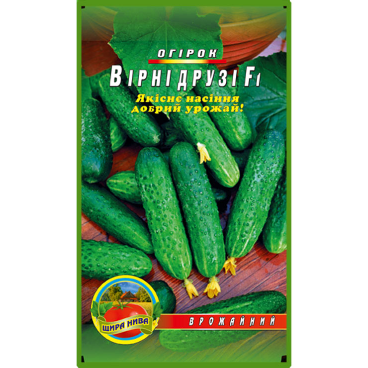 Огірок Вірні друзі Надранній бджолозапильний гібрид для відкритого ґрунту та плівкових накриттів. Період вегетації 37-39 днів. Салатного та консервного призначення. В пазусі листка закладається 2-7 зав’язів. Кожна рослина дає до 47 овально-циліндричних, довжиною 8-10 см, плодів без гіркоти, масою 80-115г. Цінність сорту – ранньостиглість, дружня віддача урожаю, висока товарність, добрі смакові якості свіжих та консервованих плодів.
