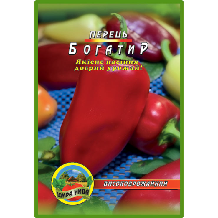 Перець “Богатир“. Середньостиглий сорт перцю (125-160 днів). Рекомендований для вирощування на присадибних ділянках та в плівкових теплицях. Рослина потужна, висока (55-60 см), розлога. Плоди дуже великі (150-160 г.), конусоподібні, злегка ребристі, товщина стінок 5-5,5 мм. Забарвлення плодів в технічній стиглості світло-зелений, біологічній – червоний. Сорт стійкий до вертицильозного в’янення, верхівкової гнилі, мозаїці. Має відмінну якість плодів з високим вмістом аскорбінової кислоти (вітаміну С)- найбільш важливого вітаміну для нормальної життєдіяльності людини. Відрізняється гарною транспортабельністю. Одним з переваг є вирівняність плодів. Рекомендується для використання у свіжому вигляді та консервуванні.