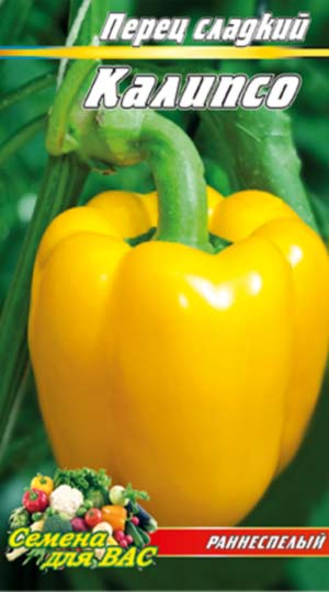 Перець “Каліпсо” Сорт ранньо -стиглого терміну дозрівання. Рослина штамбова, сомкнута, низькоросла. Плід кубовидний, гладкий, слабо ребристий, трьох-чотирьох камерний, рівний. В технічній стиглості – жовтувато-білий, в біологічній – лимонно-жовтий. Маса плоду – 70-100 г., товщина стінок – 6-7 мм. Цінність сорту – в великоплідності, привабливостю забарвленням плодів, товстостінності, хороших смакових якостях.