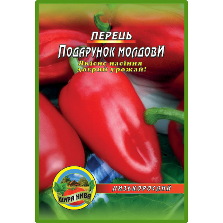 Перець “Подарунок Молдови”. Рослина напіврозлога, низькоросла, висотою 35-45 см. Плоди пониклі, конусоподібні, довжиною 9-10 см, масою 50-80 г, товщина стінок 4-5 мм. Смакові якості добрі. В біологічній стиглості темно-червоні. Стійкий до хвороб. Універсального використання. Вирощують через розсаду, яку підготовлюють протягом 50-60 днів. Висівають в лютому-березні у ящики, потім сіянці пікірують (4х4см), а через три тижні пересаджують у горщики або у парник. У грунт висаджують після холодів на початку травня. Площа живлення 60х40, 40х40, 50х40см. Для кращого приживлення розсади, бажано давати 1-2 посадкових полива з перервами в 3-5 днів. Найкращі ґрунти – суглинні, супіщані, заливні, не переносить важкі глиняні і кислі.