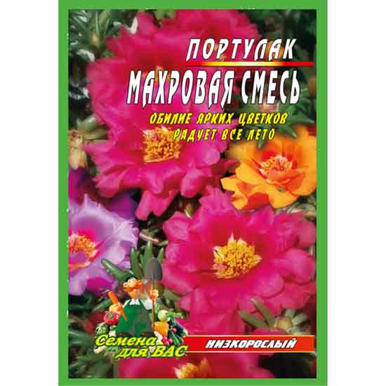 Портулак “Махрова суміш”. Багаторічна рослина, що використовується як однорічник. Пагони стеляться або повзучі, висотою до 15-20 см. Квіти до 3-4 см у діаметрі, різноманітного забарвлення. Насіння висівають у лютому-квітні у теплицю або у квітні-травні безпосередньо у відкритий грунт. При температурі 15-17°С сходи з’являються на 7-10 день. Добре росте тільки на відкритих освітлених ділянках з родючим грунтом. Сорт використовують переважно для бордюрів, рабаток, у квітниках, для озеленення балконів і як горшечну культуру.Виробництво “Наша Грядка”.Оптова та роздрібна цінаКупити оптом