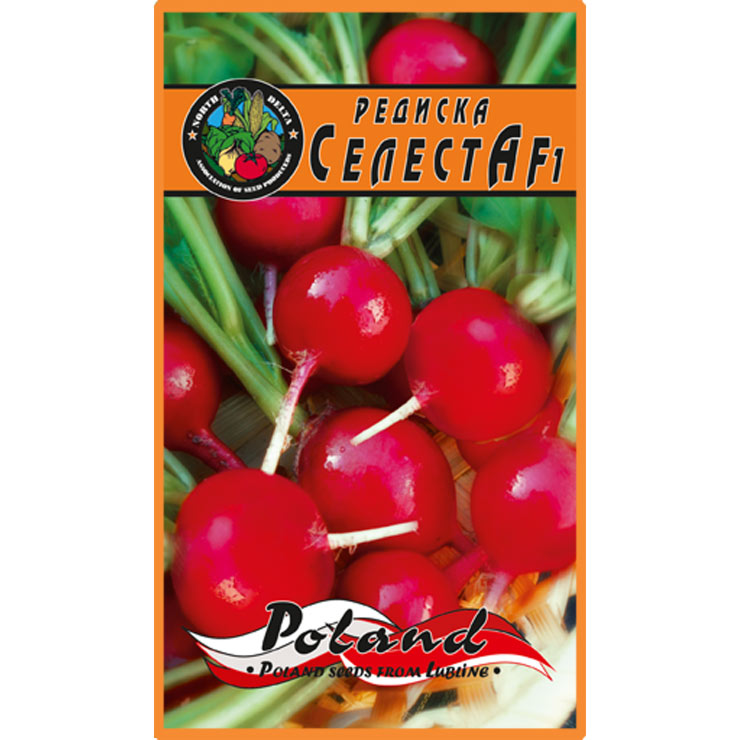 Редис “Селеста f1”. Ранньостиглий сорт. Збір врожаю проводиться через 24 дні після посіву. Коренеплоди мають вирівняну округлу форму, відрізняються гладкою поверхнею, забарвленою в червоний колір. Середня маса коренеплоду при правильному догляді може досягати 28-30 г. Гібрид «Селеста» має білу і дуже соковиту м’якоть, а також володіє відмінними смаковими якостями. Овочева культура цього гібрида може вирощуватися в період з першої декади березня до середини листопада і не схильна до стрілкування і цветушности. Гібрид придатний для вирощування у відкритому грунті і в якості тепличної культури.