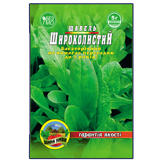 Щавель “Широколистий”. Скоростиглий сорт. Період вегетації від сходів до технічної стиглості 45-50 днів. Розетка велика, що не розлога. Листя подовженої форми з копійовидною основою, темно-зеленого кольору, довжиною 12-14 см. Рослина вологолюбна, добре виносить затінення. На одному місці щавель дає високі врожаї протягом 3-4 років, потім посадки потребують оновлення.
