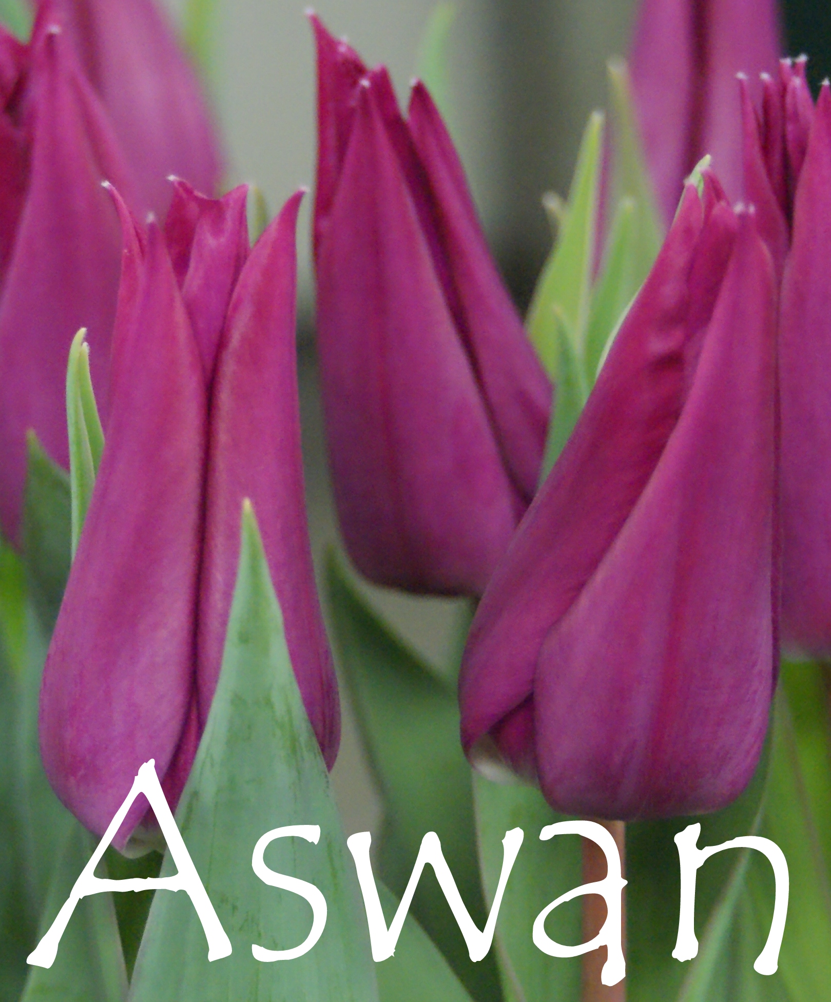 Тюльпан Асван (Tulip Aswan) клас: Лілієцвітні. Форма: келихоподібна. Забарвлення квітки: пурпурний. Висота келиха: до 6 см. Висота рослини: 45-50 см. Терміни цвітіння: квітень-травень. Квітка класична, велика. Розмножується відмінно. Дає чудову вигонку.