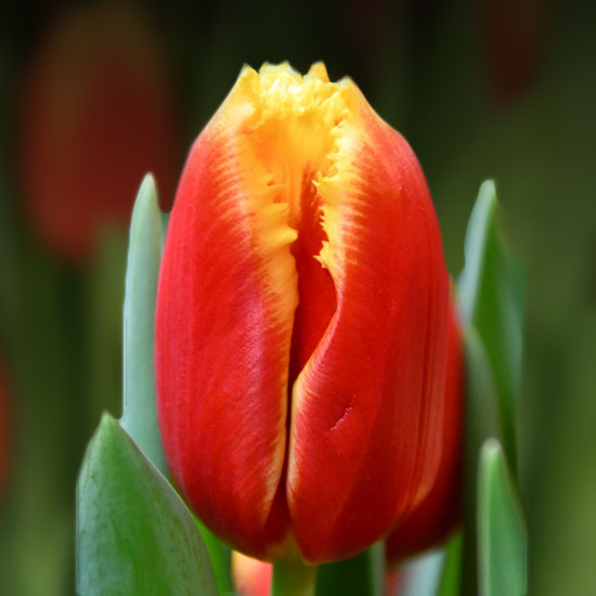 Тюльпан Девенпорт (Tulip Davenport) »клас: Бахромчаті. Форма: бокаловидная. Забарвлення: червоне з густою жовтою бахромою. Висота келиха: до 8 см. Діаметр келиха: до 6 см. Висота рослини: до 55 см. Терміни цвітіння: кінець травня. Квітка класична, велика. Розмножується відмінно. Дає чудову вигонку.