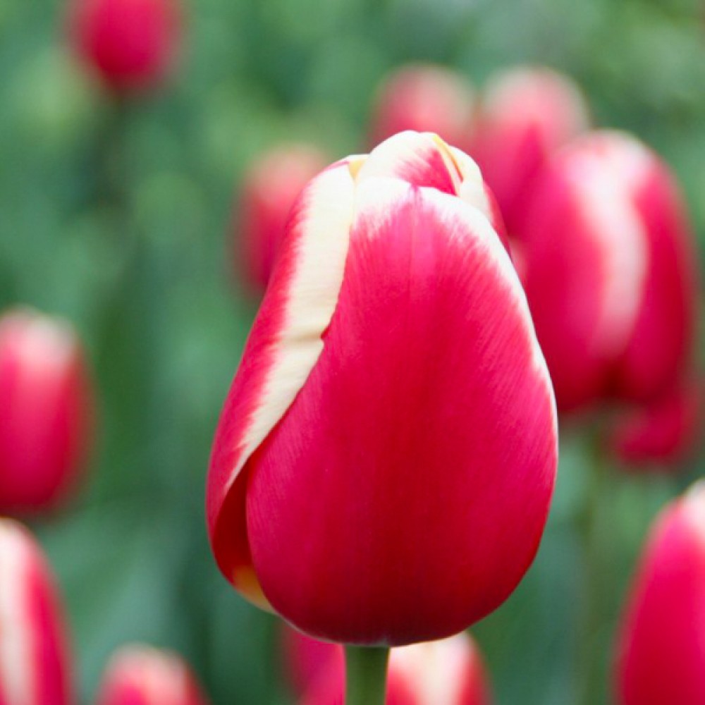 Тюльпани Тріумф (Tulipa triumph) – характеризуються великими келихоподібними квітками і високими квітконосами (40-70 см). Забарвлення кольорів у тюльпанів Тріумф найрізноманітніше: від чисто-білого до темно-фіолетового. Цвітуть тюльпани Тріумф у кінці квітня – початку травня, досить тривалий час і добре зберігають форму келиха. Використовуються тюльпани Тріумф дуже широко: і на зрізання, і для оформлення садів і парків, і для вигонки в середні та пізні терміни. Нині тюльпани Тріумф – найчисленніший і популярніший клас тюльпанів. Тюльпан Крістмас Гіфт / Tuliр Christmas Gift