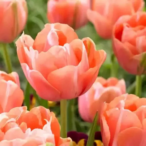 Тюльпан Ментон Екзотик (Tulip Menton Exotic) клас: Махрові. Форма: піоновидна. Забарвлення: блідо-рожеве, відтінок лососевого кольору. Висота келиха: 6-7 см. Діаметр келиха: 8-10 см. Висота рослини: до 45 см. Терміни цвітіння: – середина травня. Квітка класична, велика. Розмножується відмінно. Дає чудову вигонку.