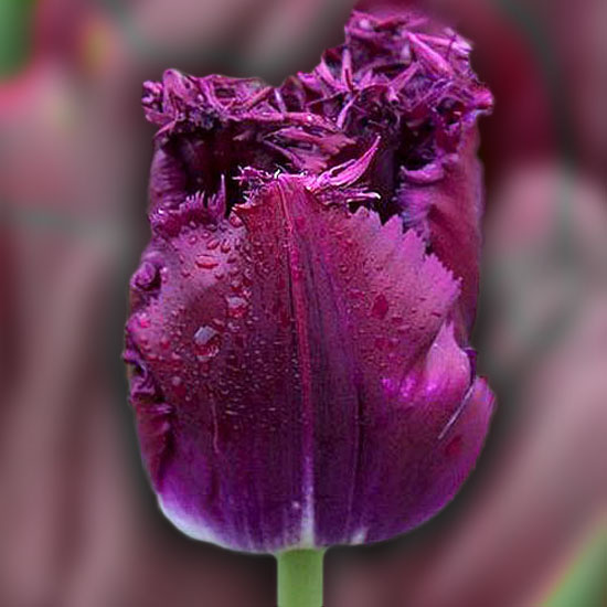 Бахромчаті тюльпани (Tulipa crispa, Tulipa fringed) – клас, який зібрав в себе сорти тюльпанів різного походження, об’єднані одною головною ознакою, ігольчаста бахрома по краям пелюсток, що нагадує іній. Висота бахромчатих тюльпанів може варіюватися від 50 до 80 см. Забарвлення квіток зустрічається найрізноманітніше: від білого до фіолетового до темно-шоколадного. Залежно від того, які класи тюльпанів використовувалися при виведенні того чи іншого сорту – бахромчаті тюльпани, розрізняються за розміром квітки, термінами цвітіння і призначенням рослин. Тюльпан Пурпл Крістал (Tulip Purple Crystal)