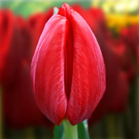 Тюльпан Ред Барон (Tulip Red Baron) клас: Тріумф. Форма: келихоподібна. Забарвлення квітки: червоний. Висота келиха: до 12+ см. Висота рослини: до 50 см. Терміни цвітіння: середній.